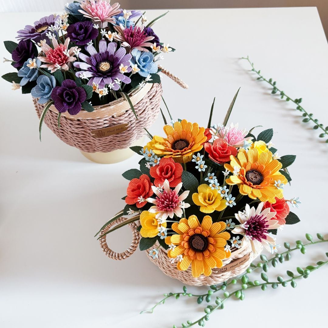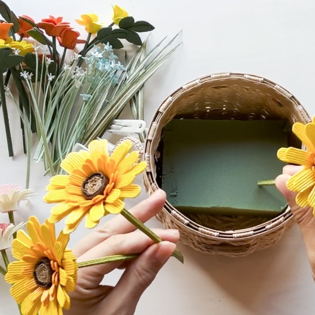 フラワーレッスン①~④で作った花を咲かせて、ループバスケットレッスンで作ったバスケットにアレンジする手順を説明した動画です。